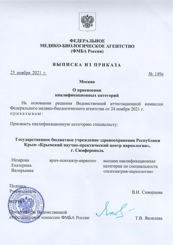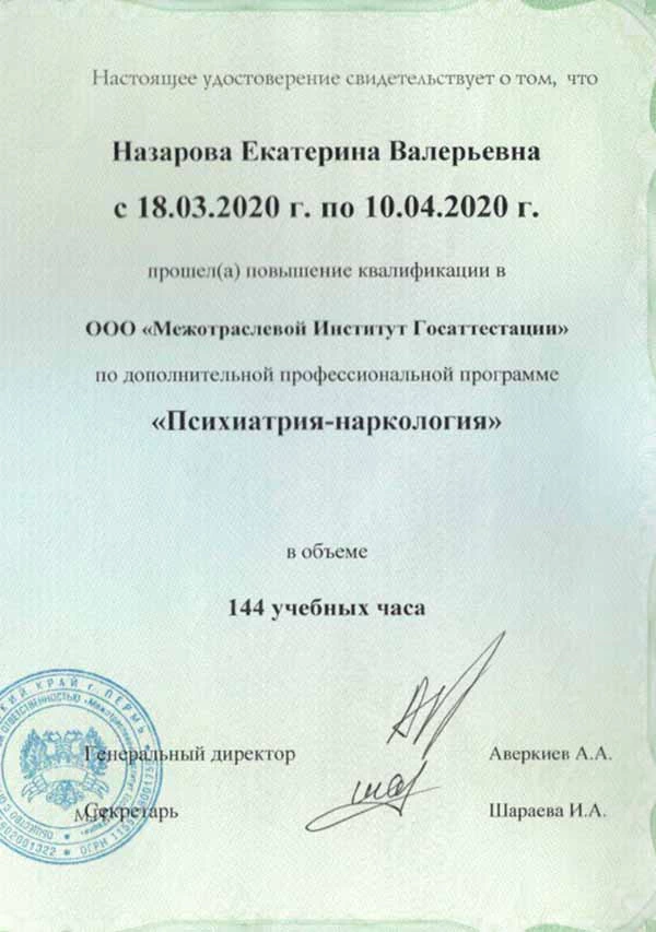 • 2020 г. — Повышение квалификации: Межотраслевой Институт Госаттестации (психиатрия, психиатрия-наркология);